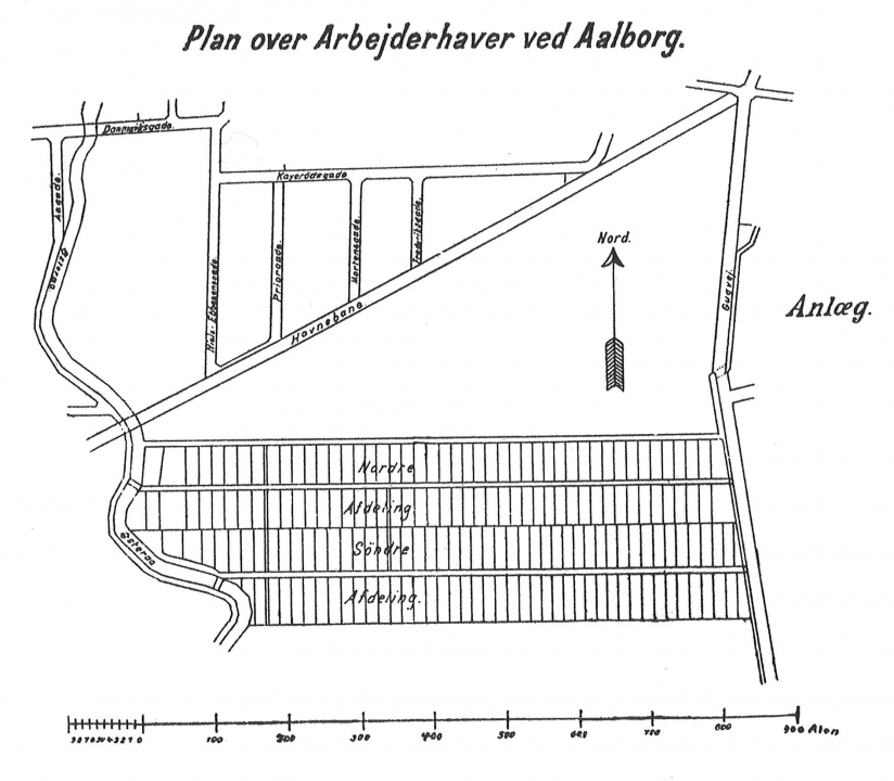 Plan over de haver, som Jørgen Berthelsen lejede i 1884 og 1886 af Aalborg Kommune og som han derefter fremlejede til arbejderne i Aalborg. Kilde: “Alletiders have – Om kolonihaver i Danmark”, Sørensen og Ravn 2008